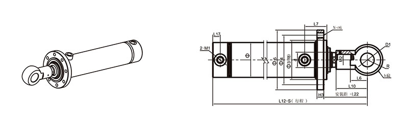 活塞桿端為內(nèi)螺紋桿頭耳環(huán)連接